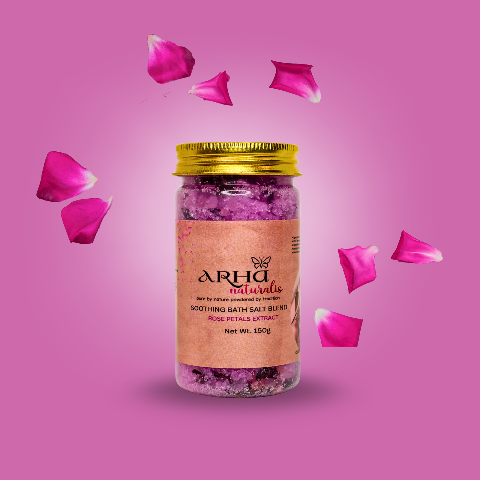 ARHA NATURALIS Rose Petals Extract Bath Salt is a luxurious infusion of mineral-rich salts and the soothing essence of roses. Enriched with Epsom salt, pink Himalayan salt, rose extract, and dried rose petals, it helps relax tired muscles, hydrate skin, and restore natural radiance. Rose essential oil uplifts the mood, reduces stress, and enhances your self-care ritual with a calming floral fragrance. Each soak feels like a spa indulgence, leaving your skin soft, nourished, and delicately perfumed.